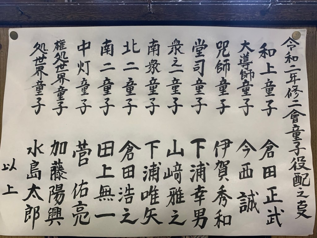 十一人の童子のうち、最も若い役職でありながら、行の中では練行衆の新入(しんにゅう)の導き手となる。教えることを通して、自分の未熟さを知ることになるのは、去年も経験したはずなのに、やはり今年もその重さには身が引き締まる。