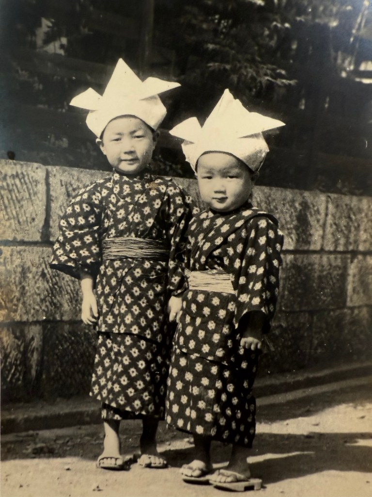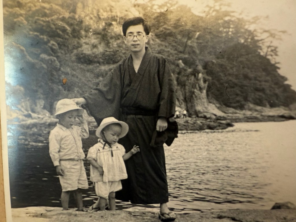 別の写真では、着物姿の祖父と、幼い兄弟が海辺に立っている。