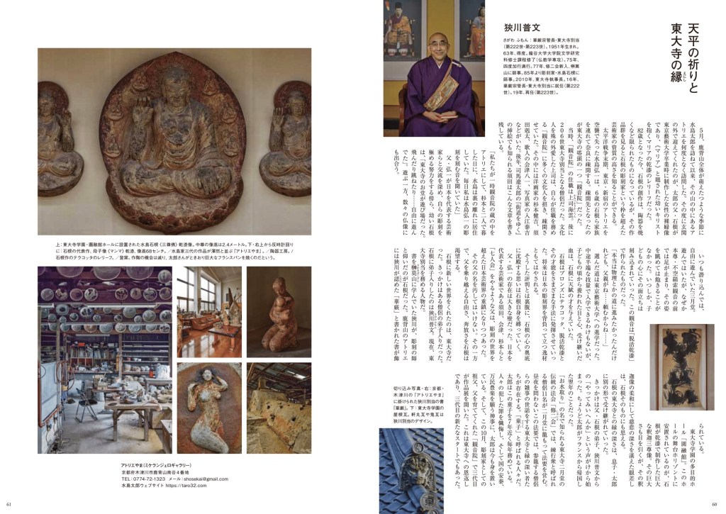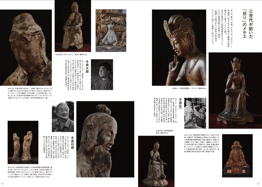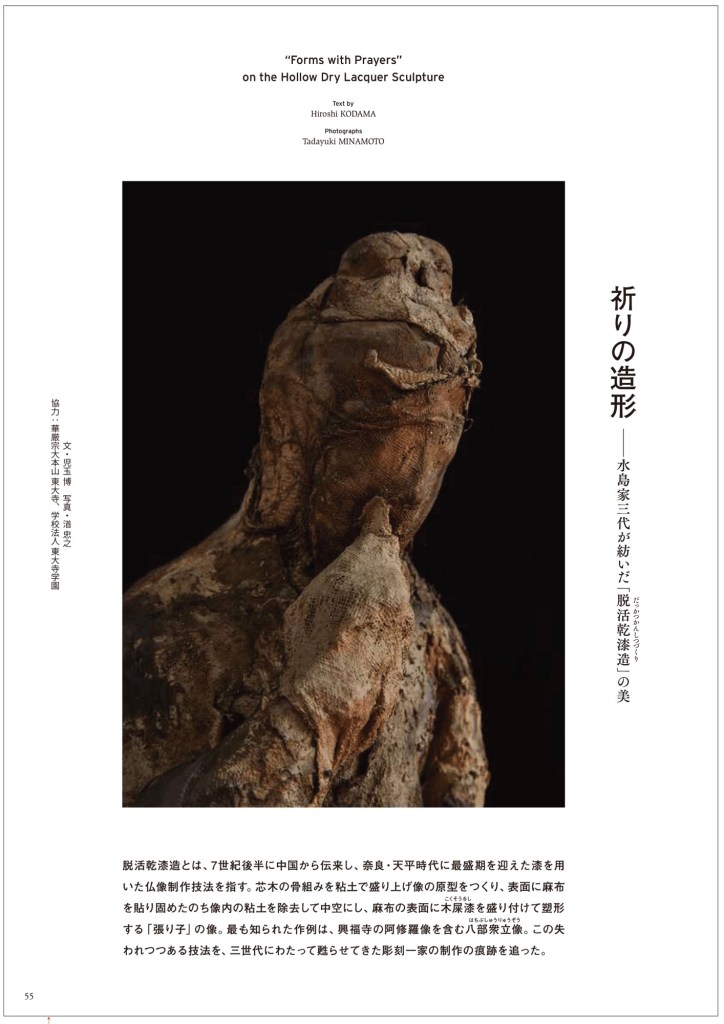 恰も仏師のように、否、修行僧のように作品に向かう。水島太郎は「脱活乾漆彫刻家」と自称しているが、それは世を忍ぶ仮の姿、実は修行僧なのだ。故に、彼の生み出す作品はピュアな精神を術佛とさせる。また、それは外見はどのようであれ、内に必ず祷りを秘めている。